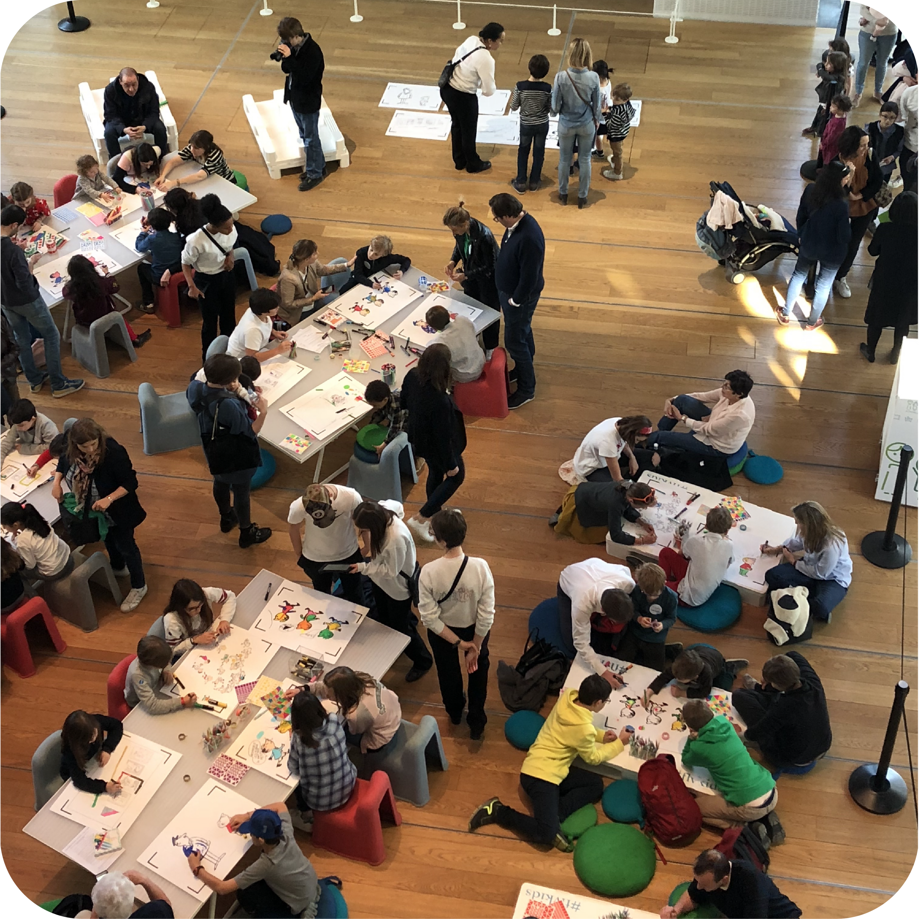 En savoir plusLe goûter d’anniversaire du Petit Nicolas en présence de Sempé où les enfants colorient de grands tirages extraits du livre